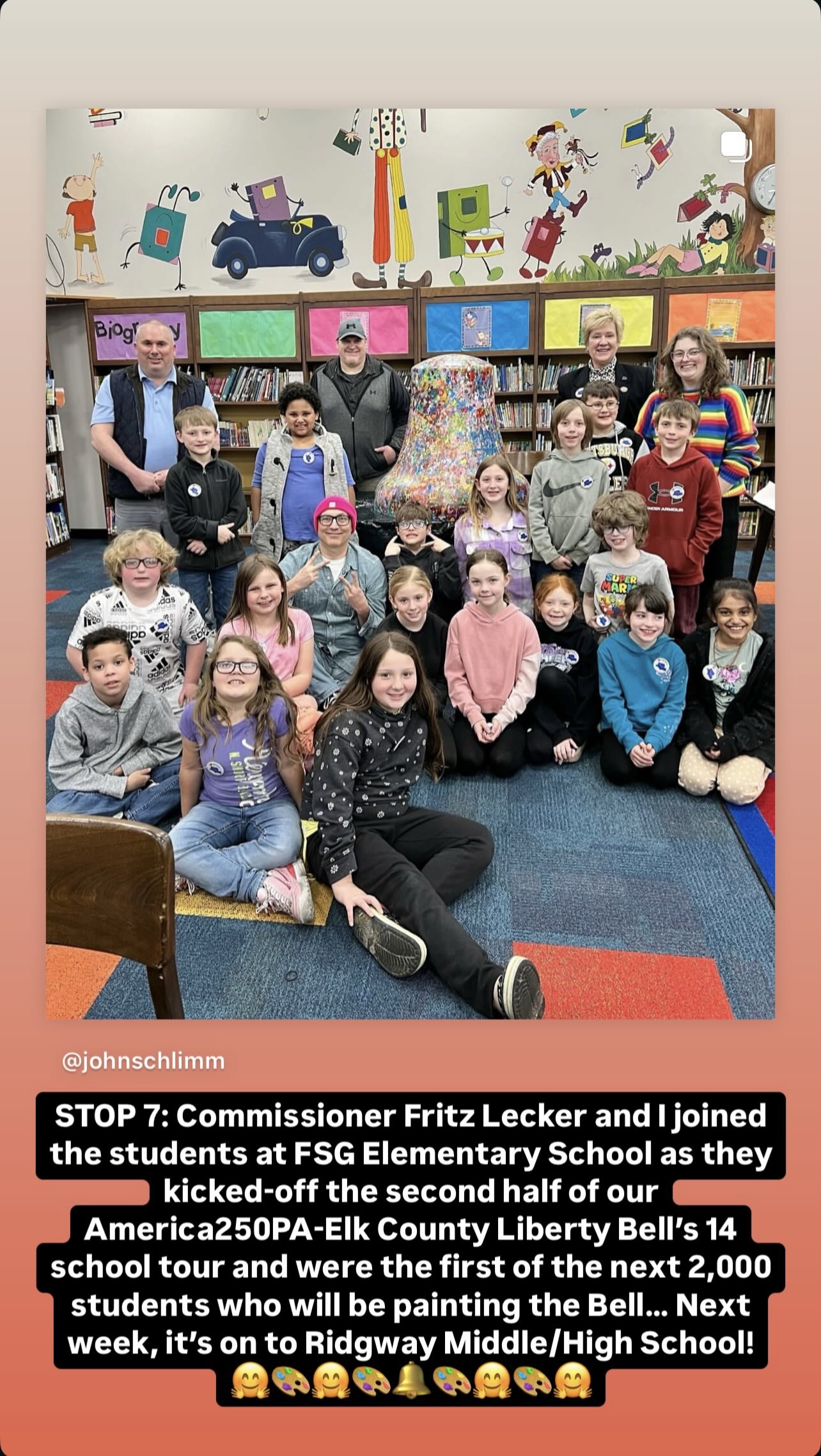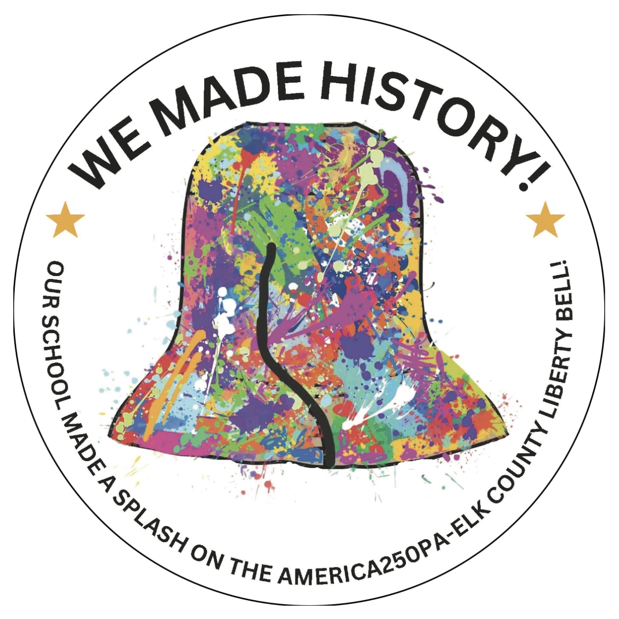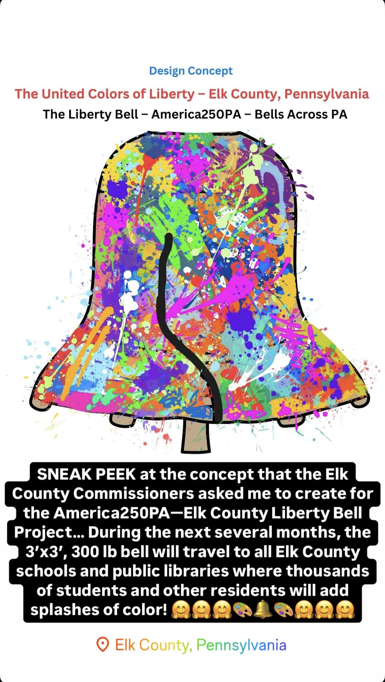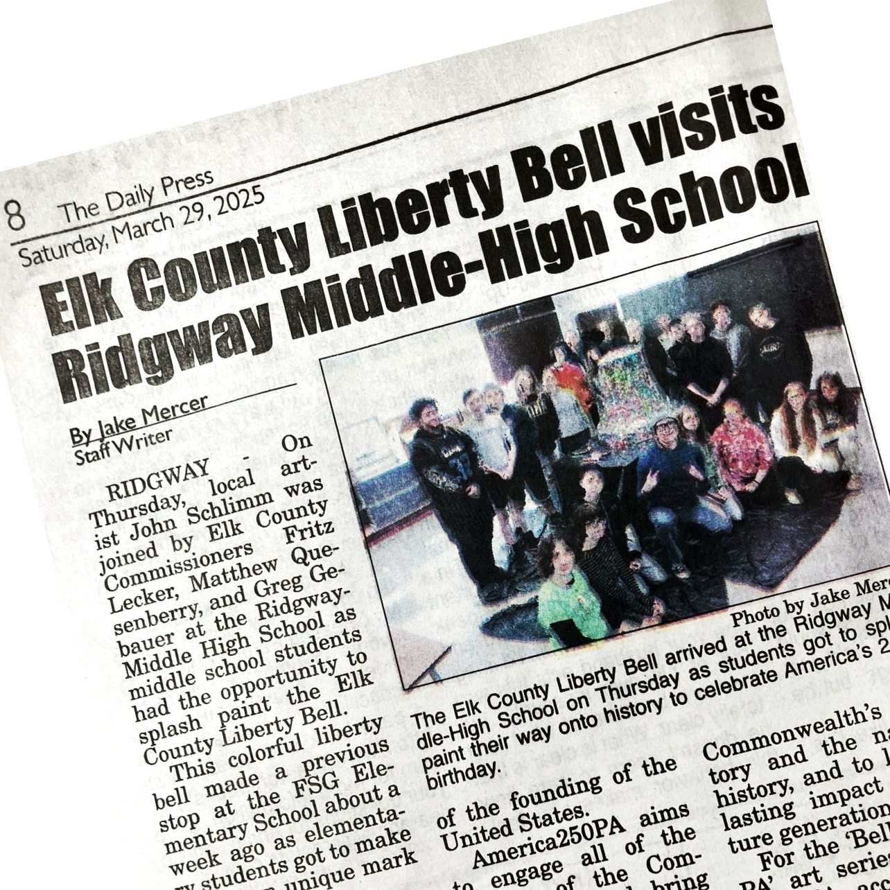 Spearheaded and sponsored by the Elk County Commissioners and conceptualized by artist John Schlimm as a Participatory/Interactive Art work titled The United Colors of Liberty—Elk County, Pennsylvania, this project gave the nearly 4,000 K-12 students across Elk County the chance to add their splash of color to the three-foot tall fiberglass replica of the iconic Liberty Bell during the Bell’s 4-month—February to May 2025—tour to all 14 Elk County schools and the Elk County Homeschool community. During Summer 2025, the Bell will be on exhibit at Elk County’s 4 public libraries and appear in all area parades.