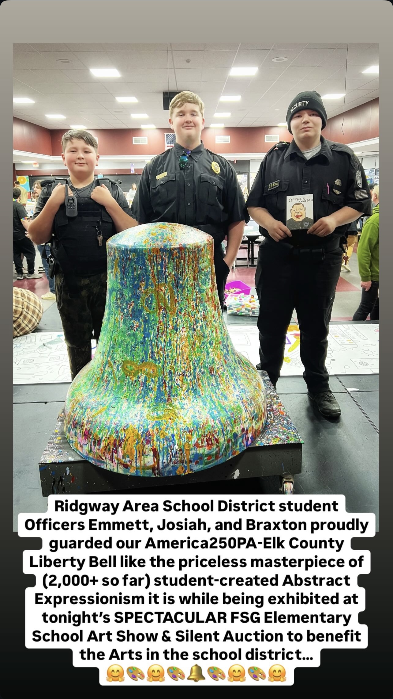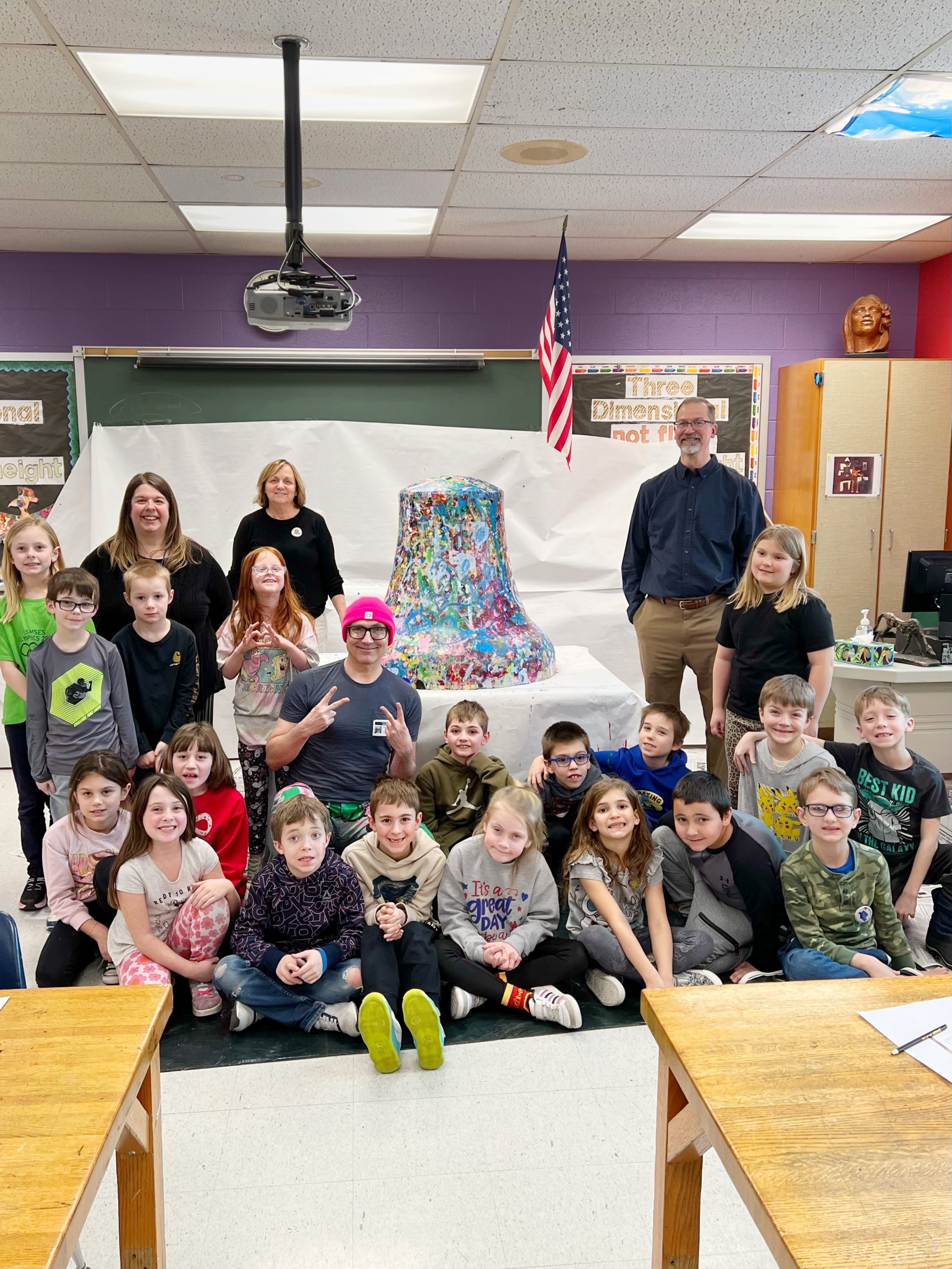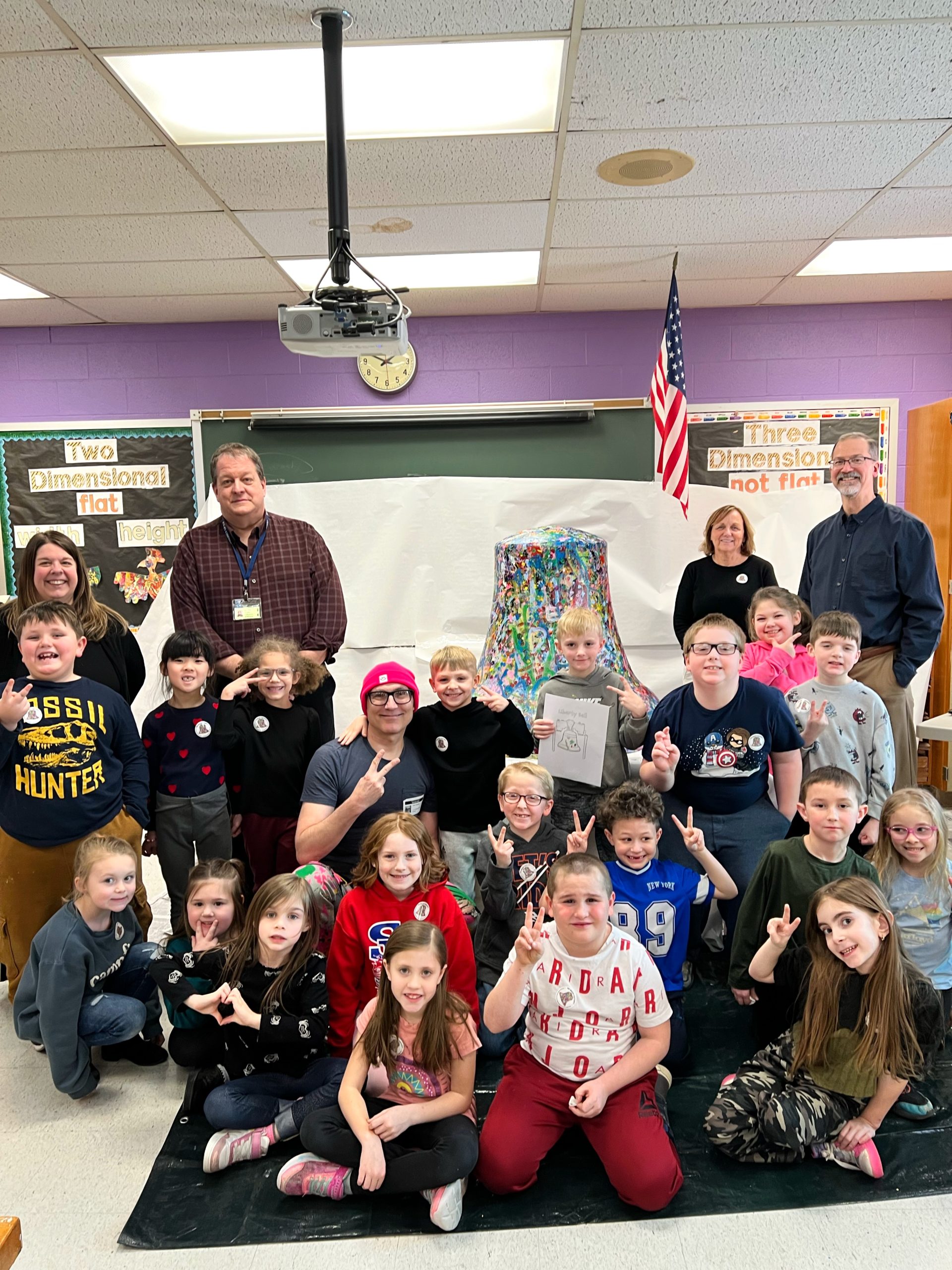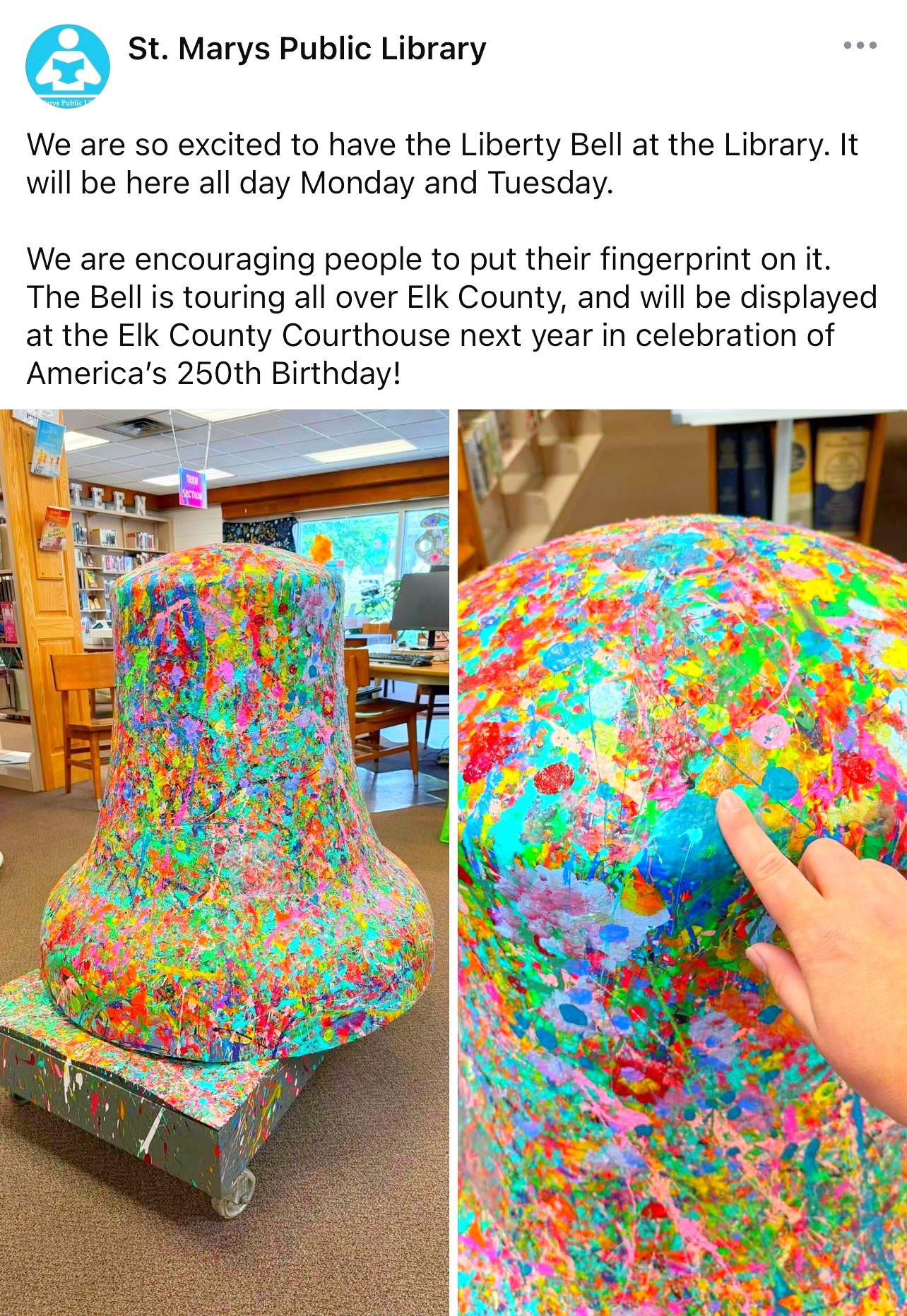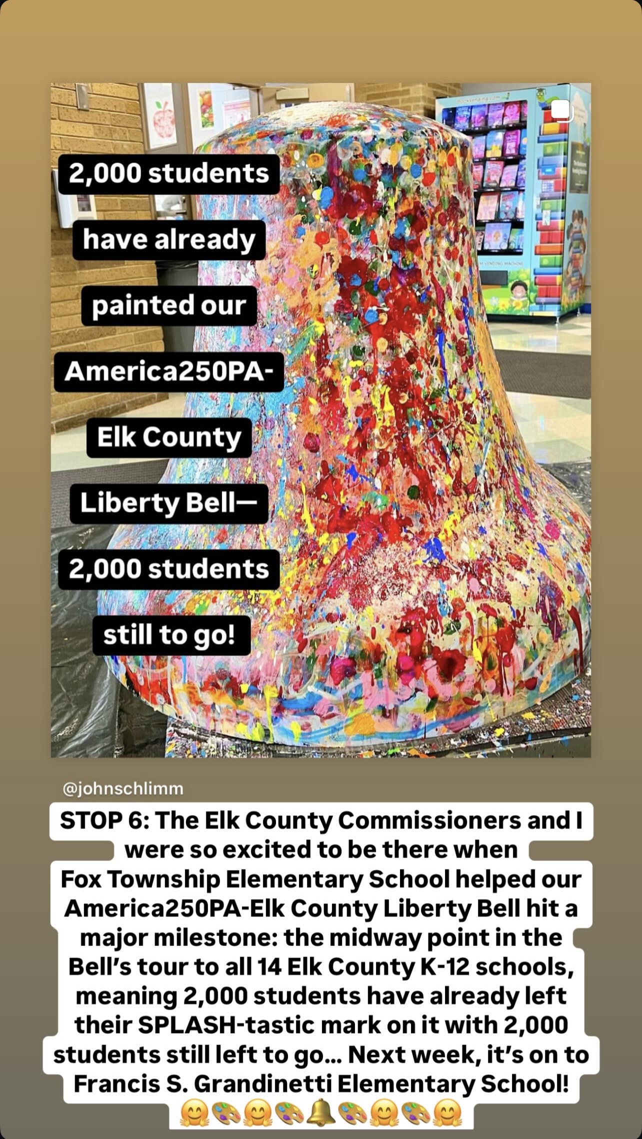 Spearheaded and sponsored by the Elk County Commissioners and conceptualized by artist John Schlimm as a Participatory/Interactive Art work titled The United Colors of Liberty—Elk County, Pennsylvania, this project gave the nearly 4,000 K-12 students across Elk County the chance to add their splash of color to the three-foot tall fiberglass replica of the iconic Liberty Bell during the Bell’s 4-month—February to May 2025—tour to all 14 Elk County schools and the Elk County Homeschool community. During Summer 2025, the Bell will be on exhibit at Elk County’s 4 public libraries and appear in all area parades.