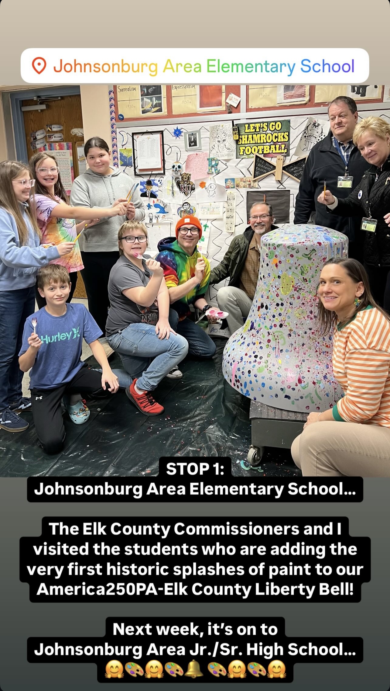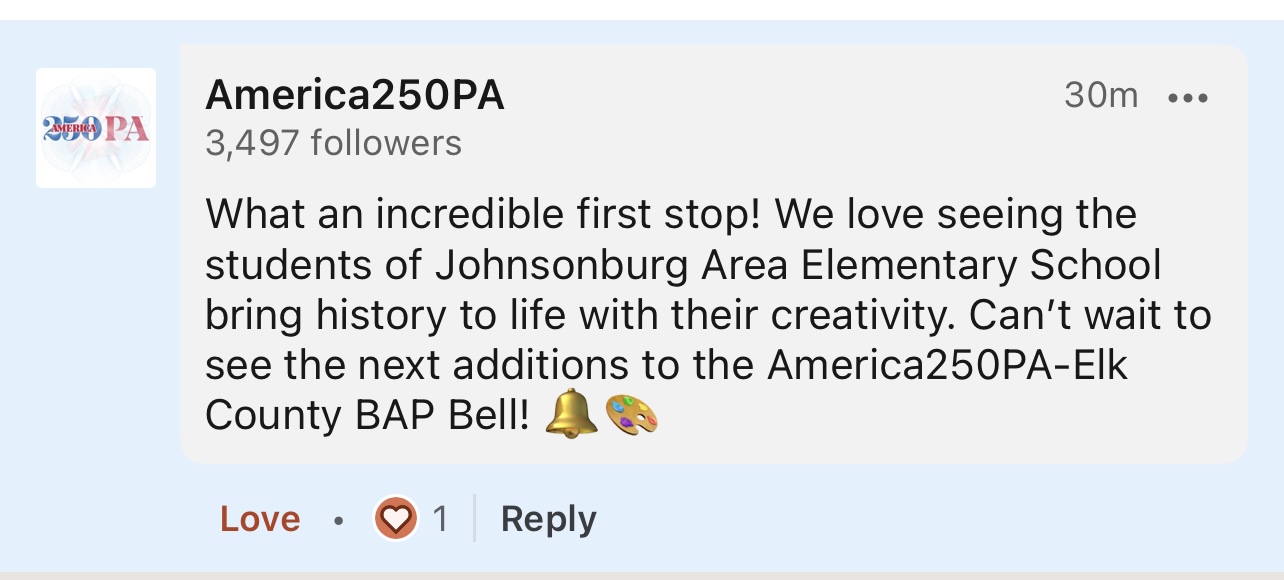 The America250PA-Elk County Liberty Bell visited Johnsonburg Area Elementary School and Johnsonburg Area Jr./Sr. High School from February 3 to 14, 2025.