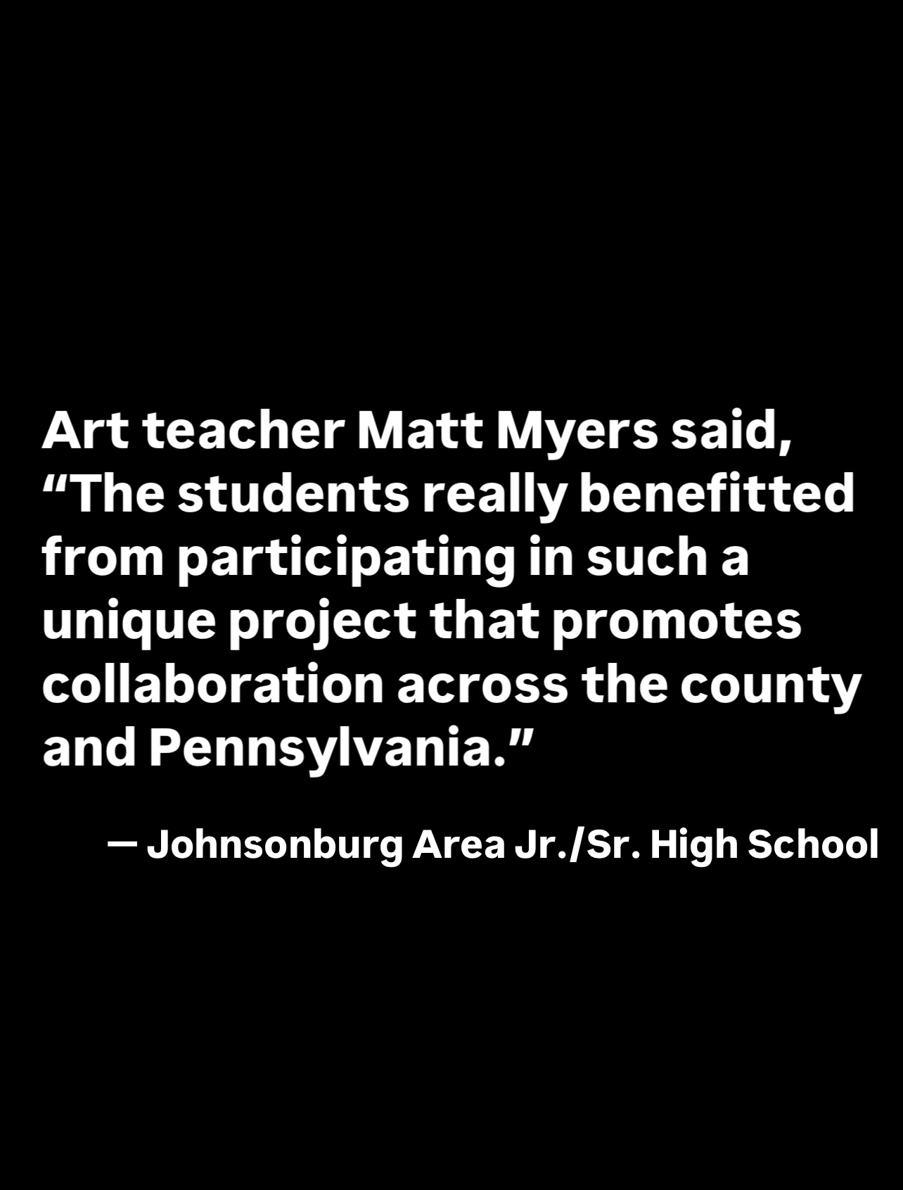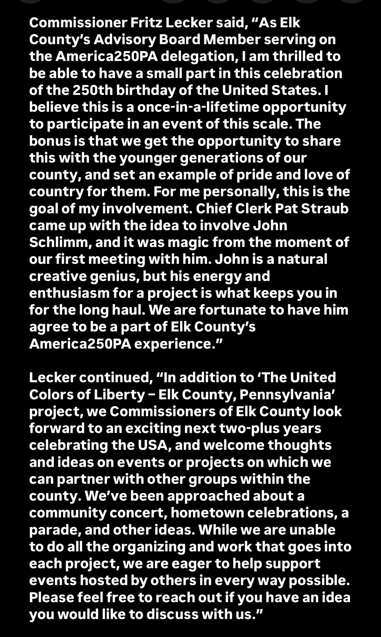 The design concept extended beyond the official project requirements, prompting the America250PA team to say that they had “not received a proposal as ambitious as this” before they resoundingly approved it. John and the Elk County Commissioners envisioned this being a rare opportunity to unite the young people and other citizens in every rural and small-town community across their 181-year-old (at the time) county—including the county’s 9 townships, 2 boroughs and 1 city—to vividly depict the imaginative, expressive, and determined spirit of Elk County, Pennsylvania, and America.