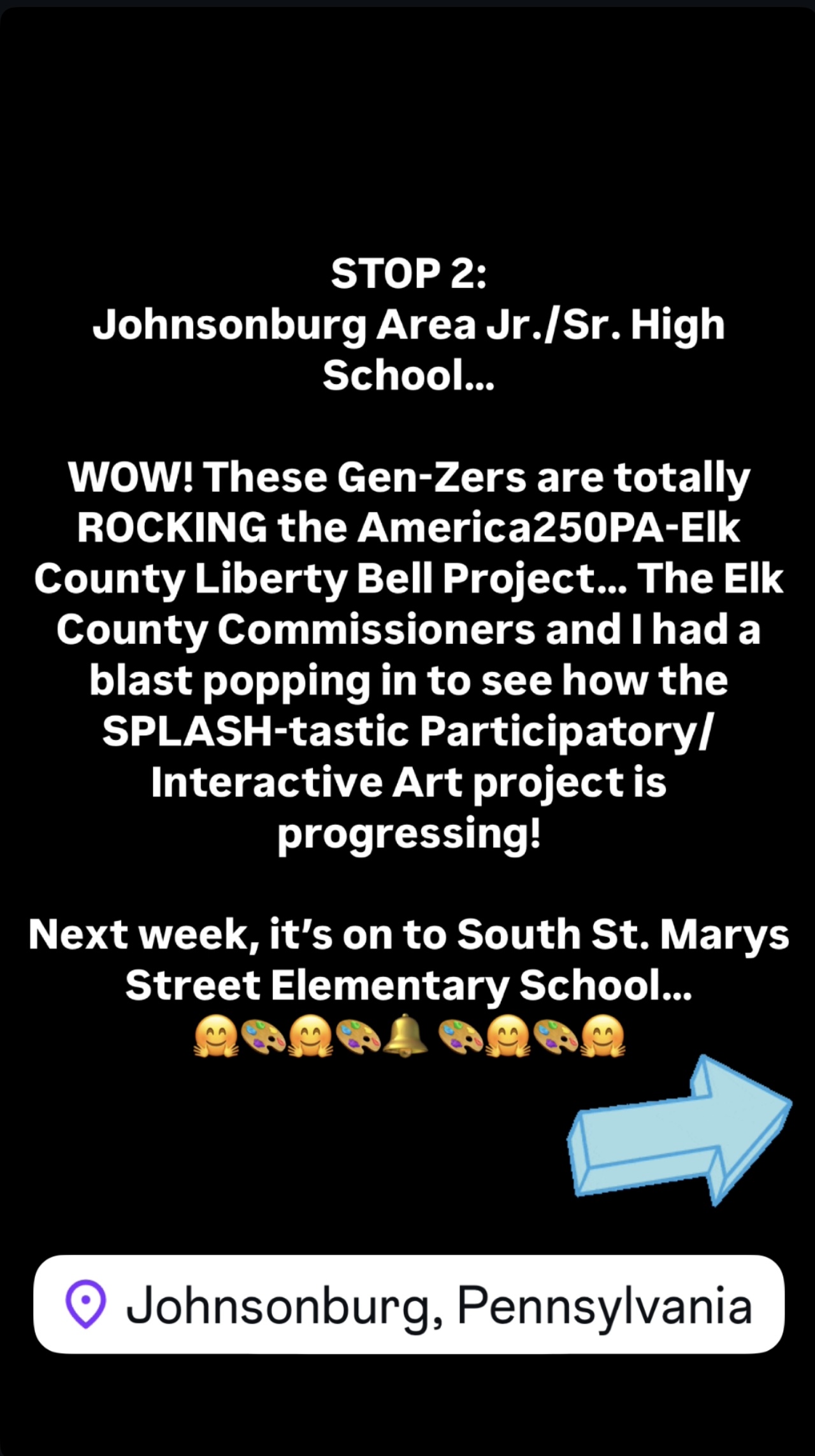 During February, March, April, and May 2025, the America250PA-Elk County Liberty Bell visited all 3 Elk County School Districts—Johnsonburg Area School District, St. Marys Area School District, and Ridgway Area School District—and the Elk County Catholic School System, which encompass 14 K-12 schools in 11 buildings, as well as inviting the Elk County Homeschool community to also paint the Bell, for a total of 4,000 Elk County students.