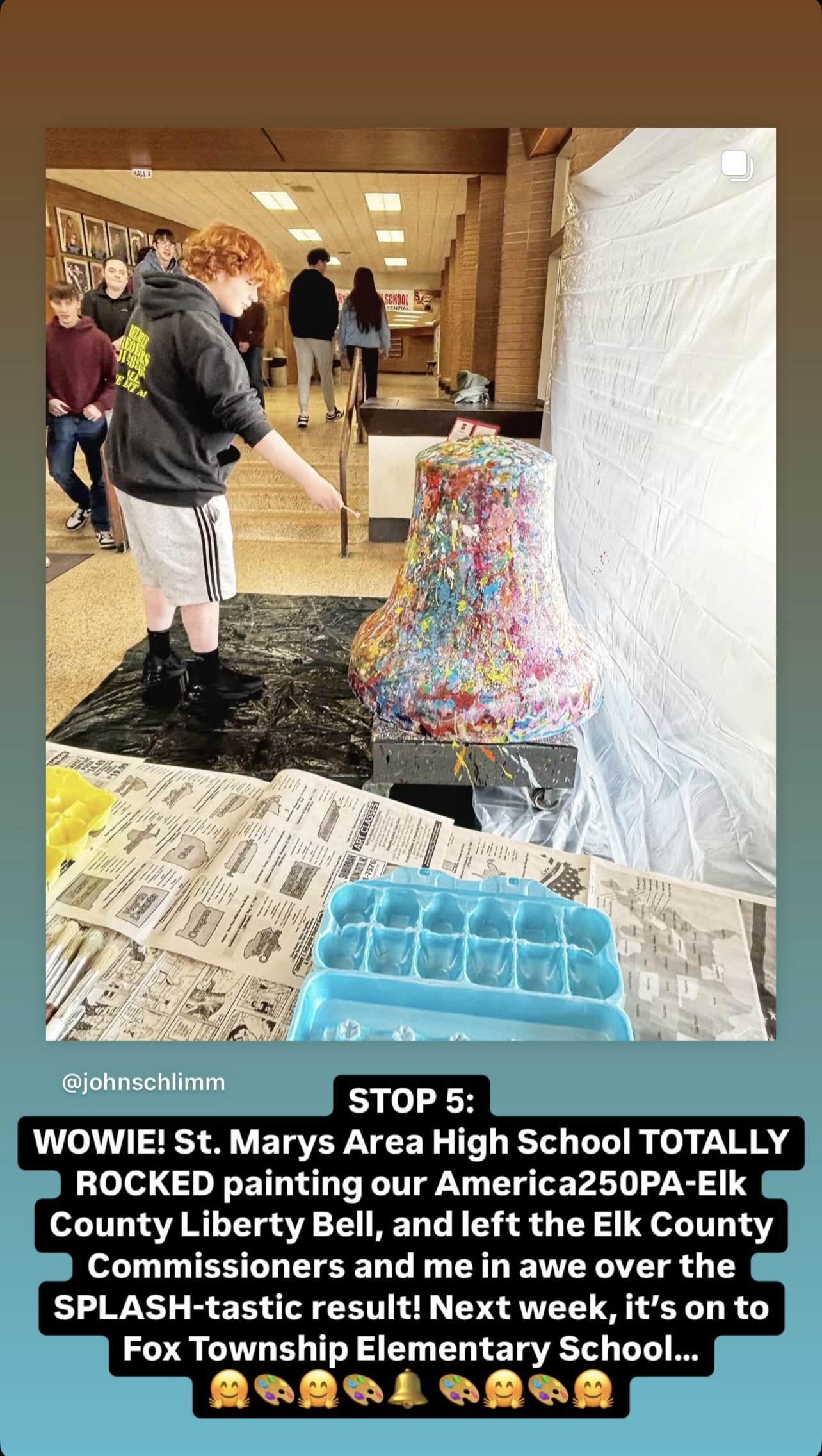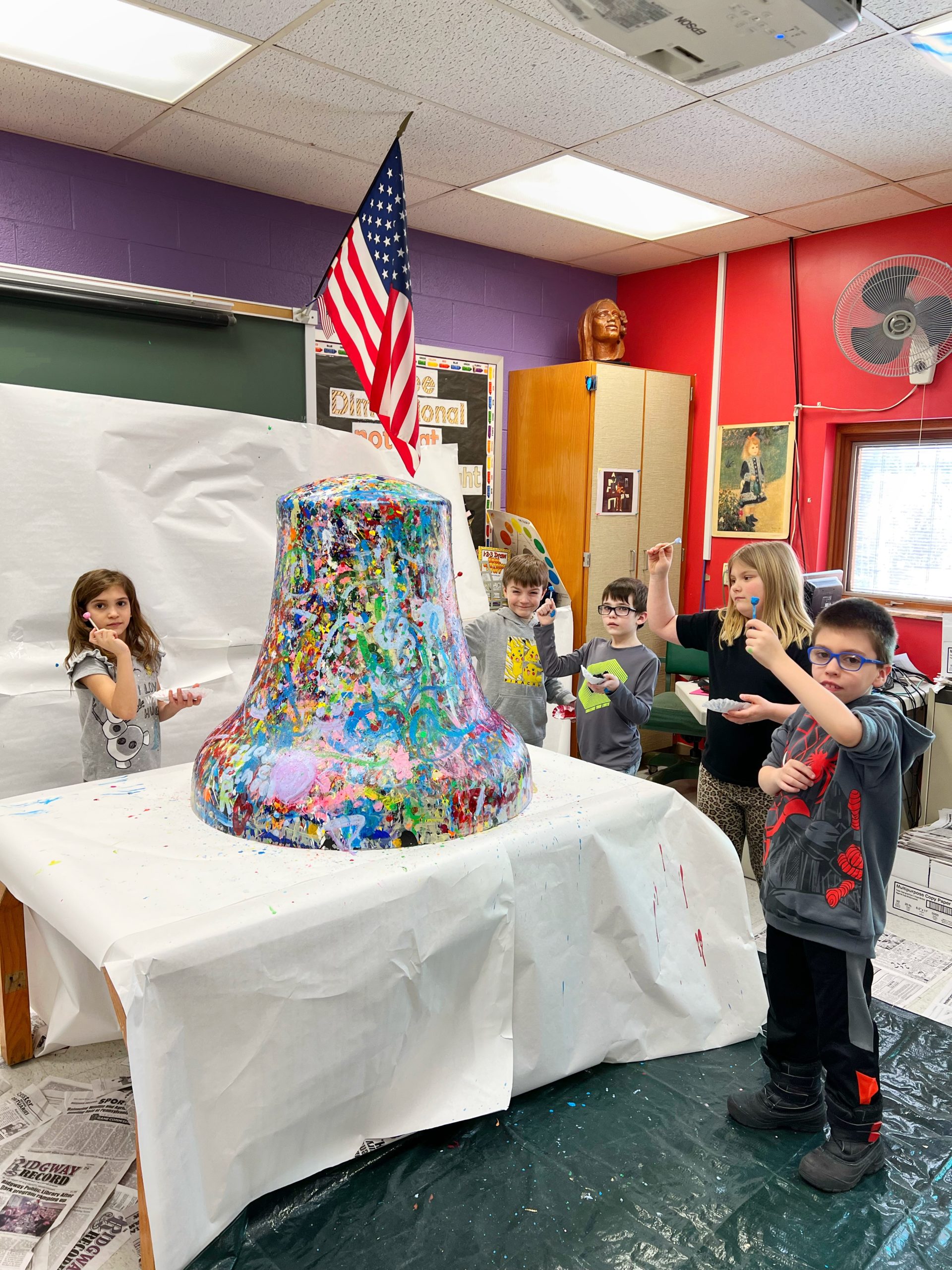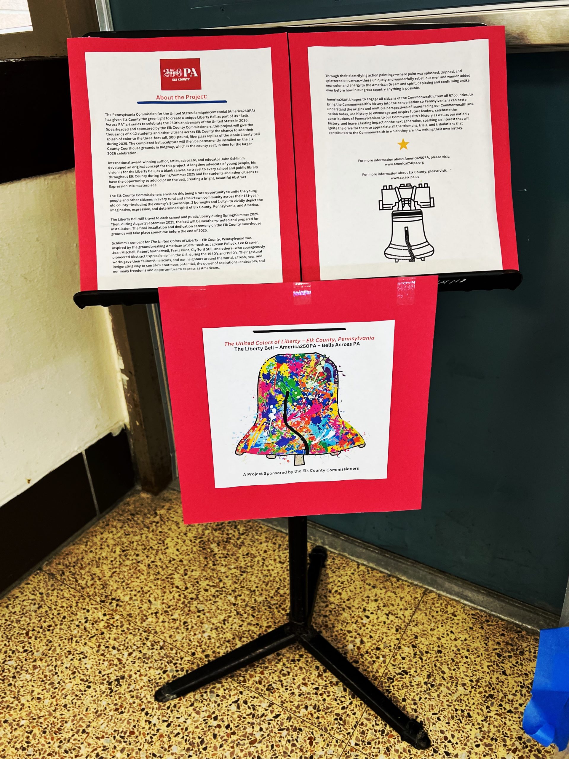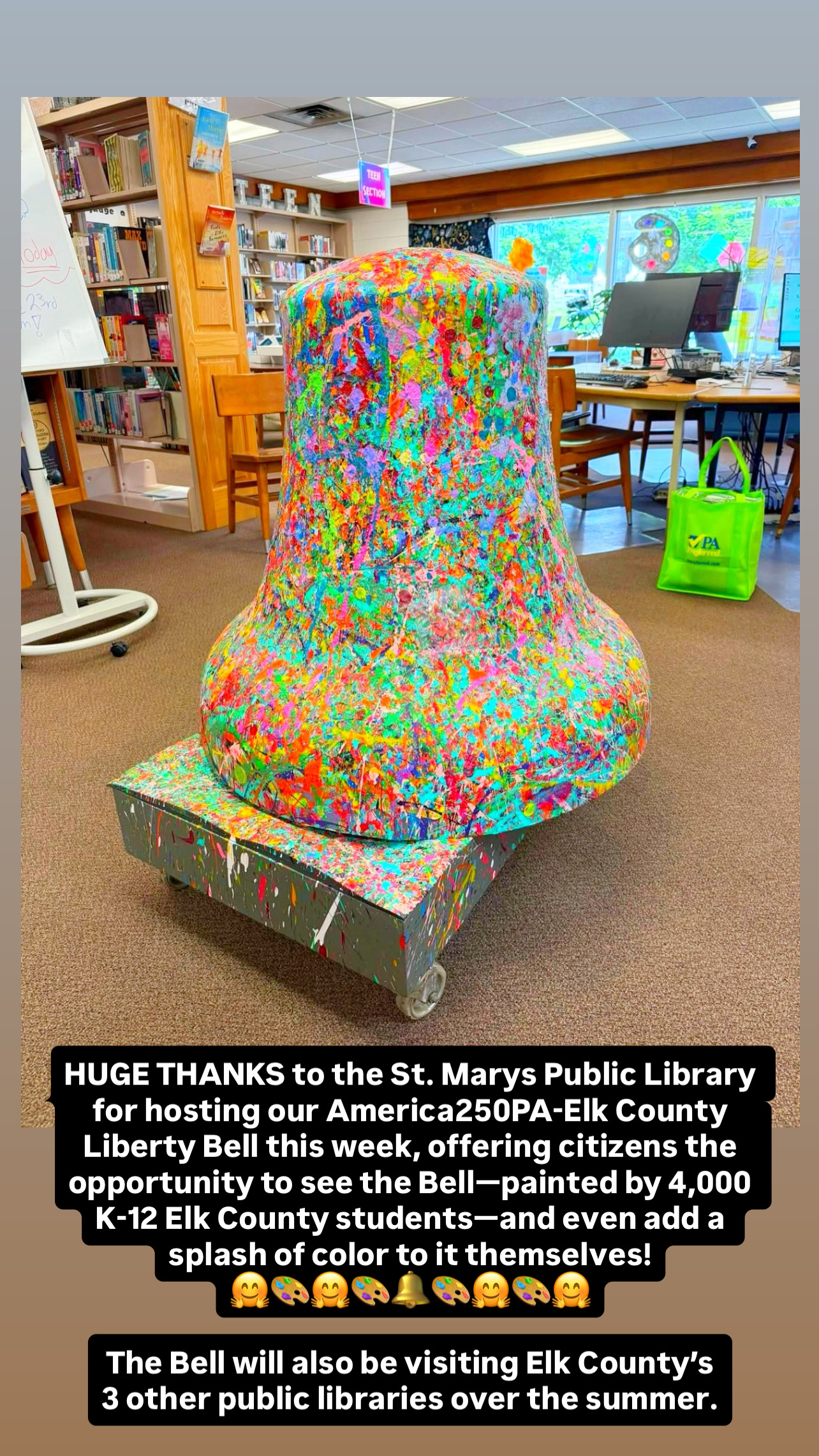 John’s vision was for the Liberty Bell, as a blank canvas, to travel to every school and public library throughout Elk County during Spring/Summer 2025 and for students and other citizens to have the opportunity to add color on the bell, creating a bright, beautiful Abstract Expressionistic masterpiece.