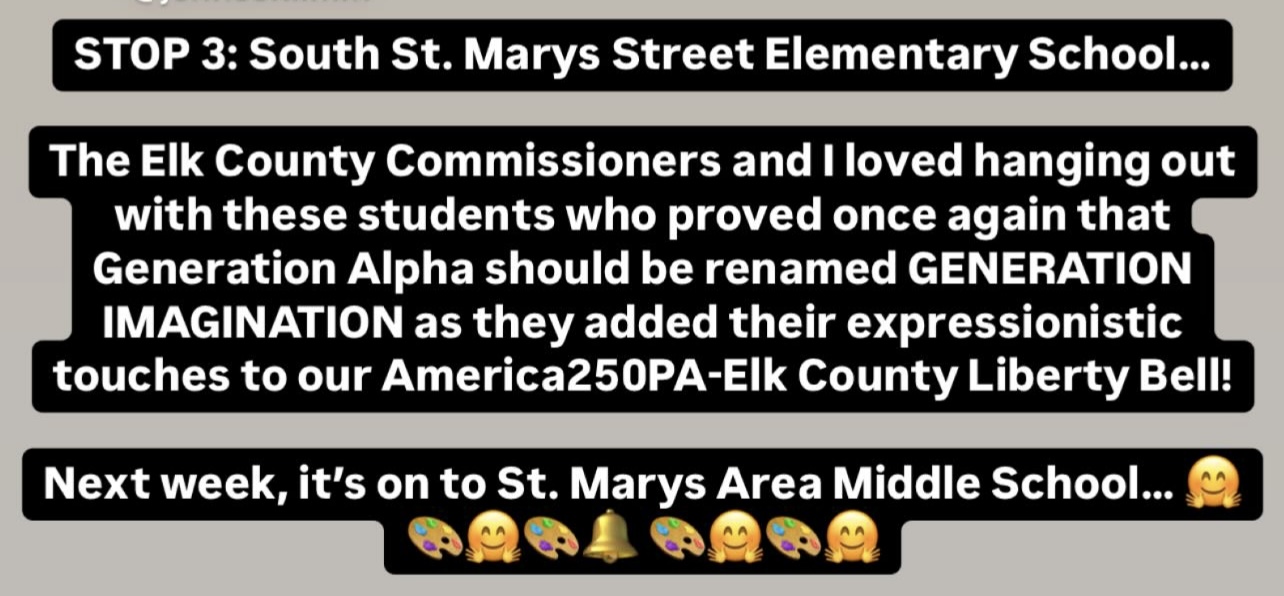The America250PA-Elk County Liberty Bell visited South St. Marys Street Elementary School, St. Marys Area Middle School, St. Marys Area High School, and Fox Township Elementary School from February 17 to March 14, 2025.