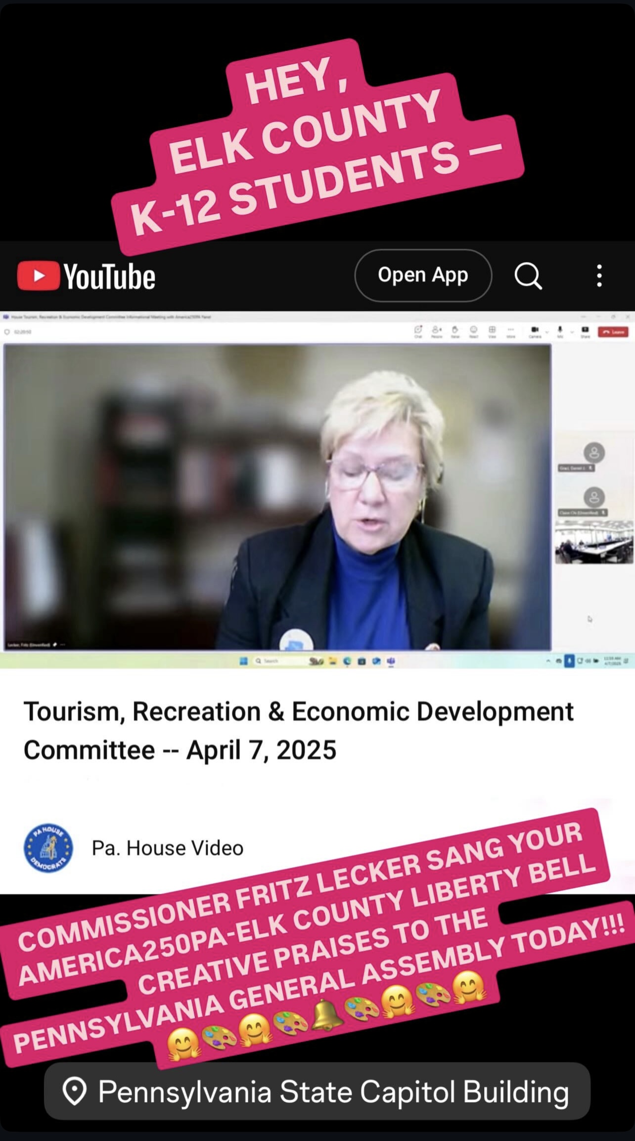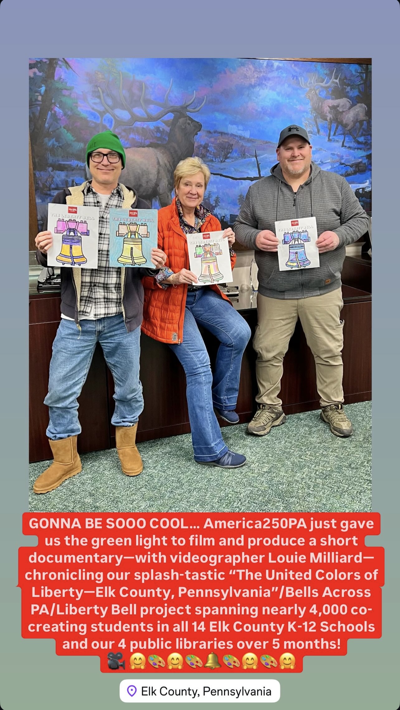 During the America250PA-Elk County Liberty Bell’s school tour, a short documentary was filmed by Louie Milliard to further share the journey of this historic project. The film will premiere in Fall 2025. This portion of the project was made possible by generous funding from America250PA.