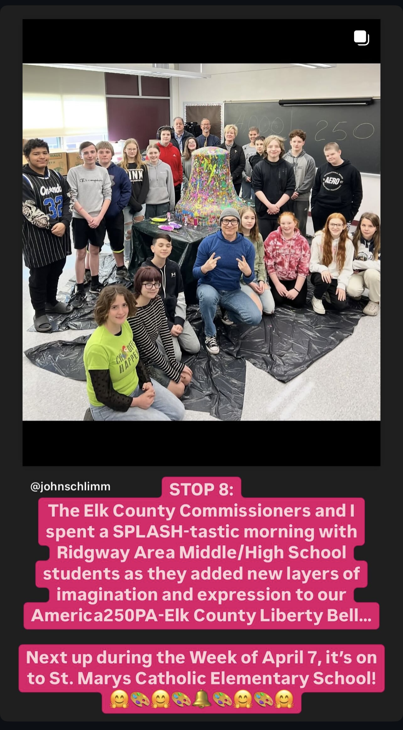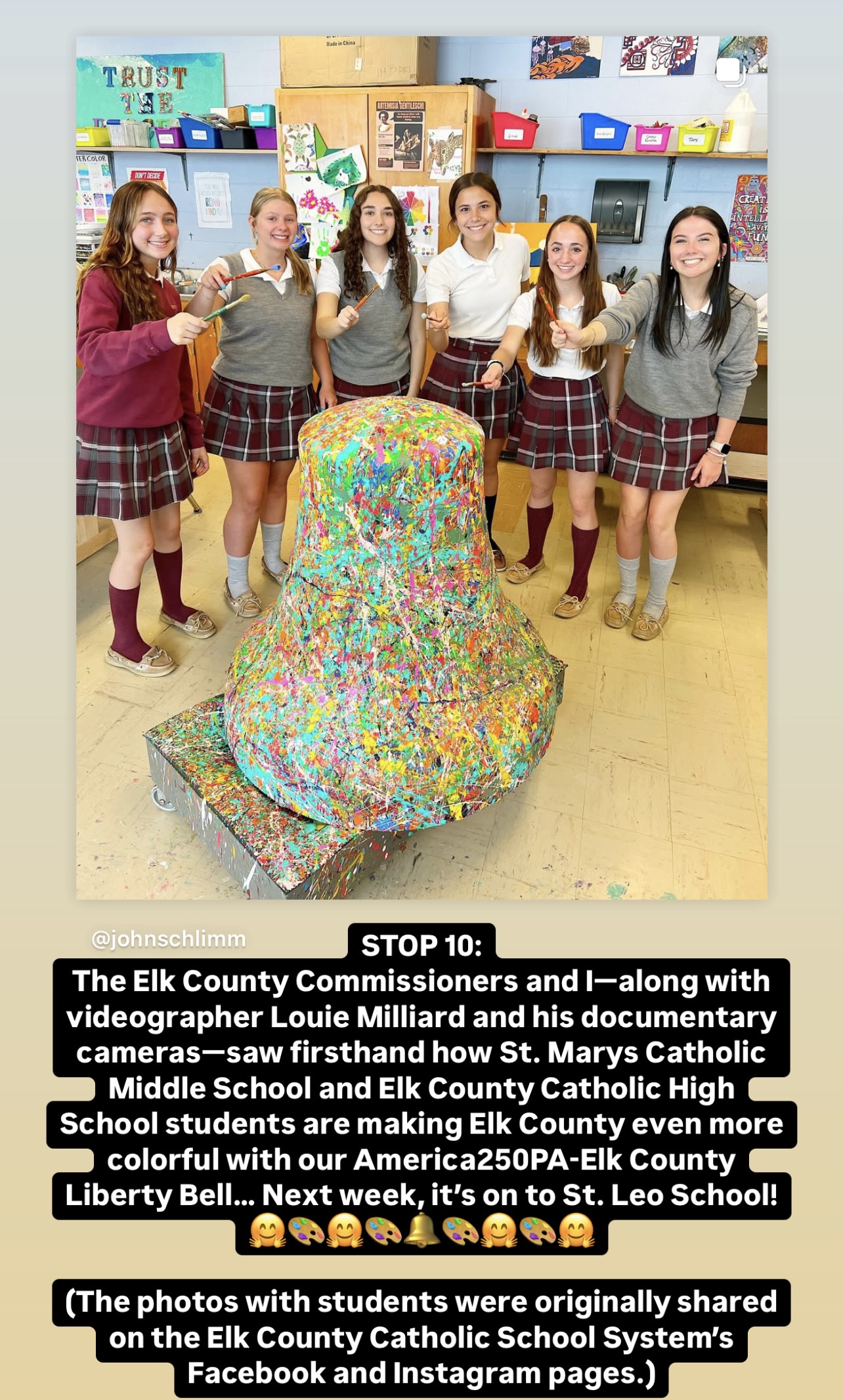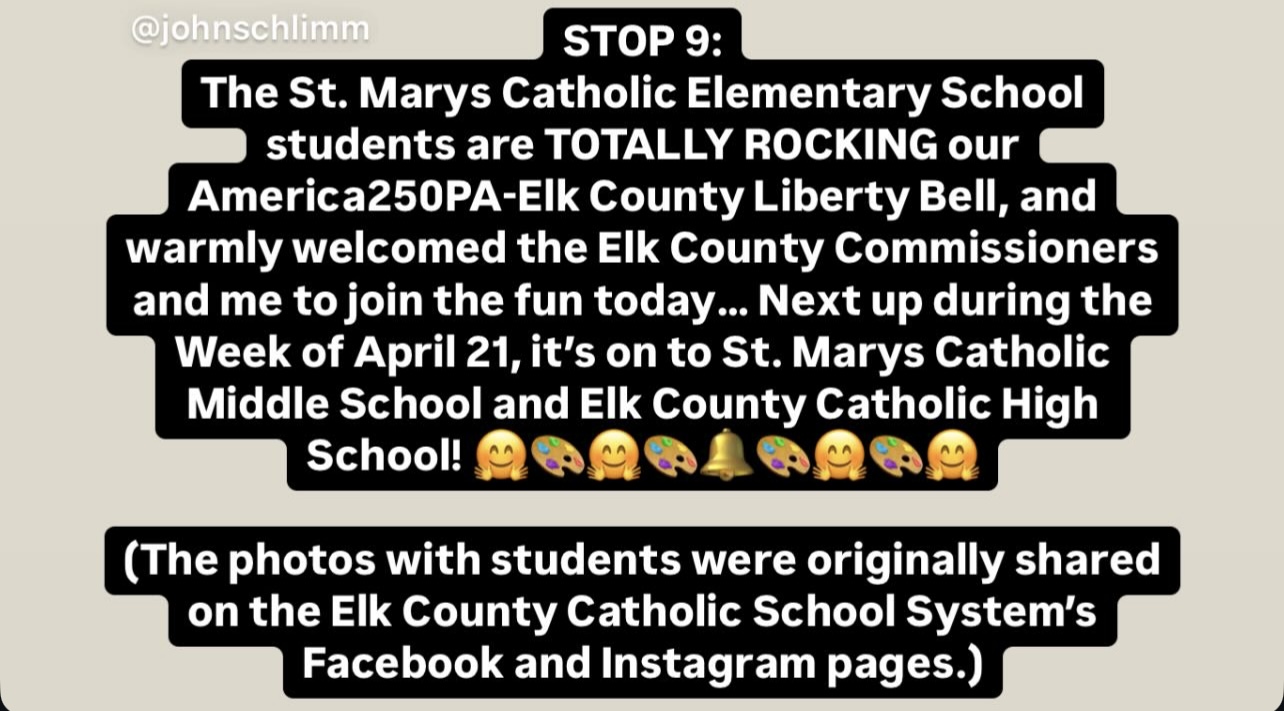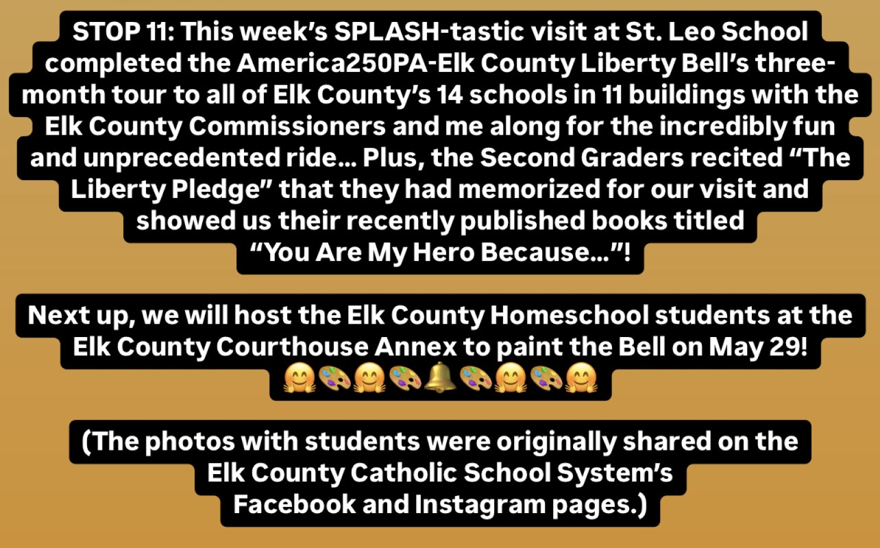 The America250PA-Elk County Liberty Bell visited St. Marys Catholic Elementary School, St. Marys Catholic Middle School, Elk County Catholic High School, and St. Leo School from April 7 to May 2, 2025.