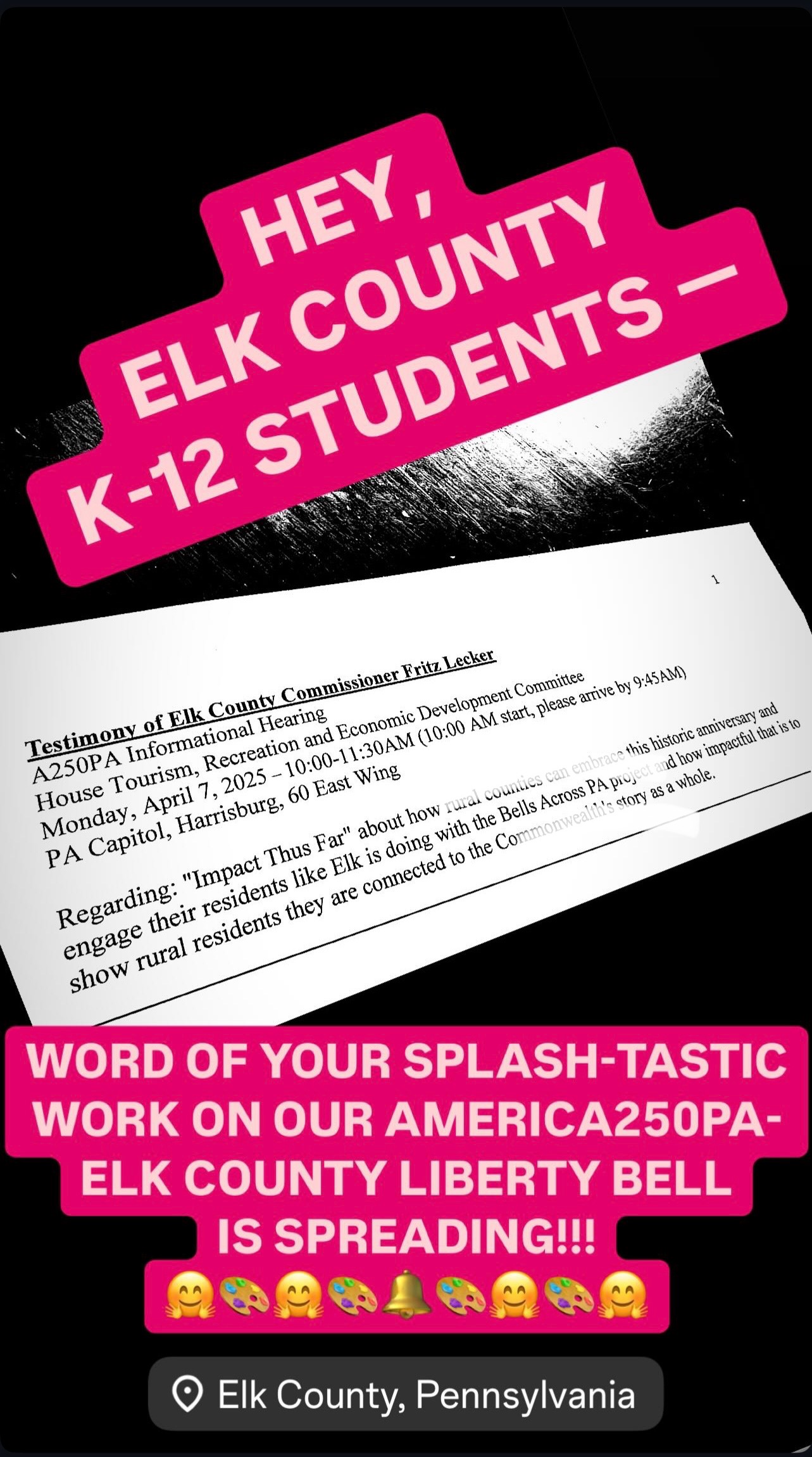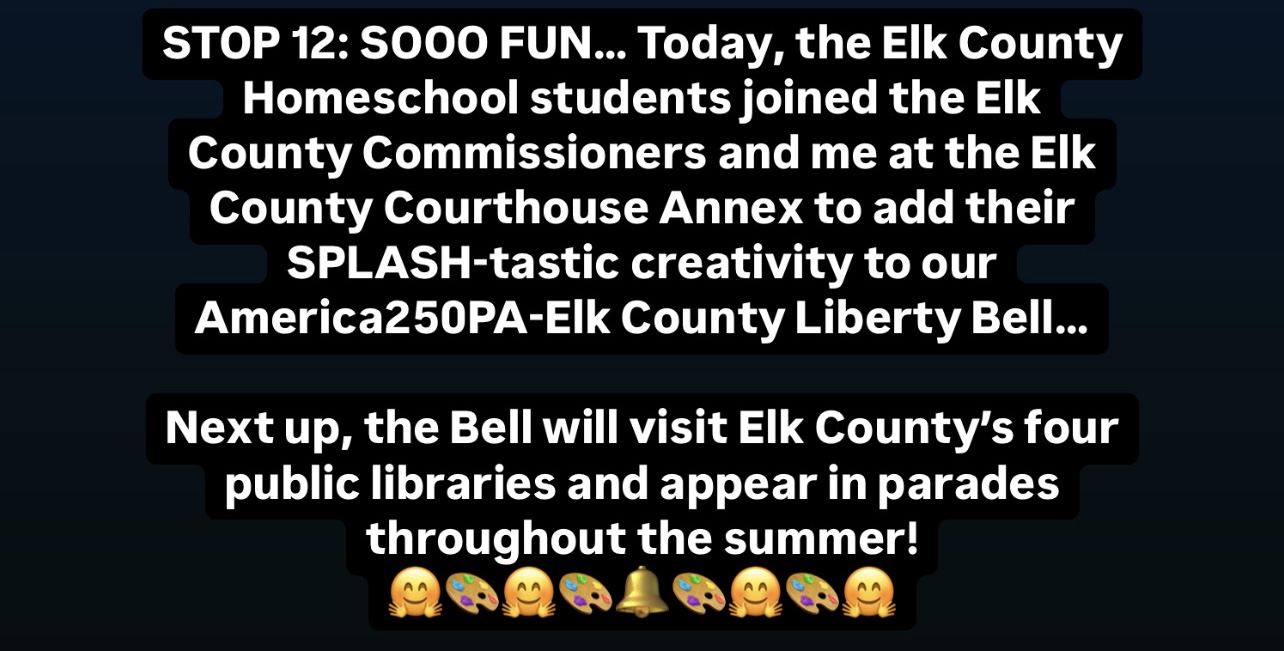 On Thursday, May 29, the Elk County Homeschool community of students visited the Elk County Courthouse Annex in Ridgway and added their SPLASH-tastic touches to the America250PA-Elk County Liberty Bell.
